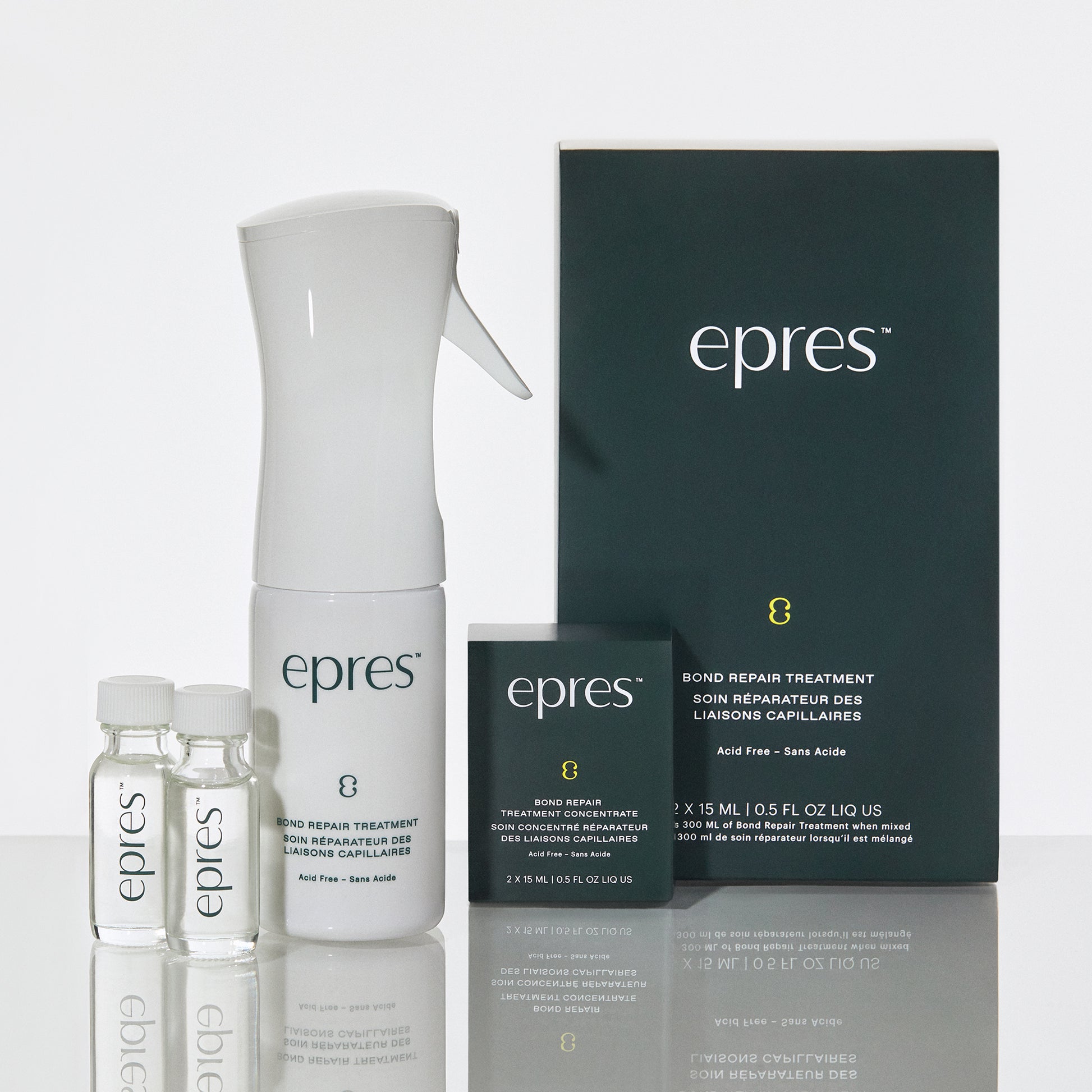 Epres is een spray-on behandeling, gebaseerd op het onderzoek van wetenschapper Dr. Eric Pressly. Met slechts 4 veganistische en biologisch afbreekbare ingrediënten, herstelt Epres Bond Repair Treatment het haar en vermindert het pluizen. Het resultaat? Zachter, sterker en gezonder haar. De unieke one-step spray-on formule maakt het haar niet vet en is gemakkelijk in gebruik. De starterskit bevat een handige sprayflacon en twee flesjes concentraat van 15 ml die je voor gebruik mengt met water en schudt.